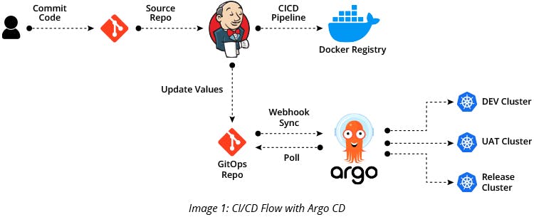 위 프로세스에서는 2가지의 Git repository가 운용된다. 하나는 어플리케이션의 코드베이스를 담고 있는 'Source repo'와 위에서 말한 배포 설정파일을 담고 있는 'GitOps repo' 가 그것이다. 지금은 K8S를 다루고 있으니, 'Deployment'를 비롯한 K8S 리소스의 각종 manifest 파일들이 'Kustomize' 기반으로 구성되어 해당 repo에서 관리될 것이다.
