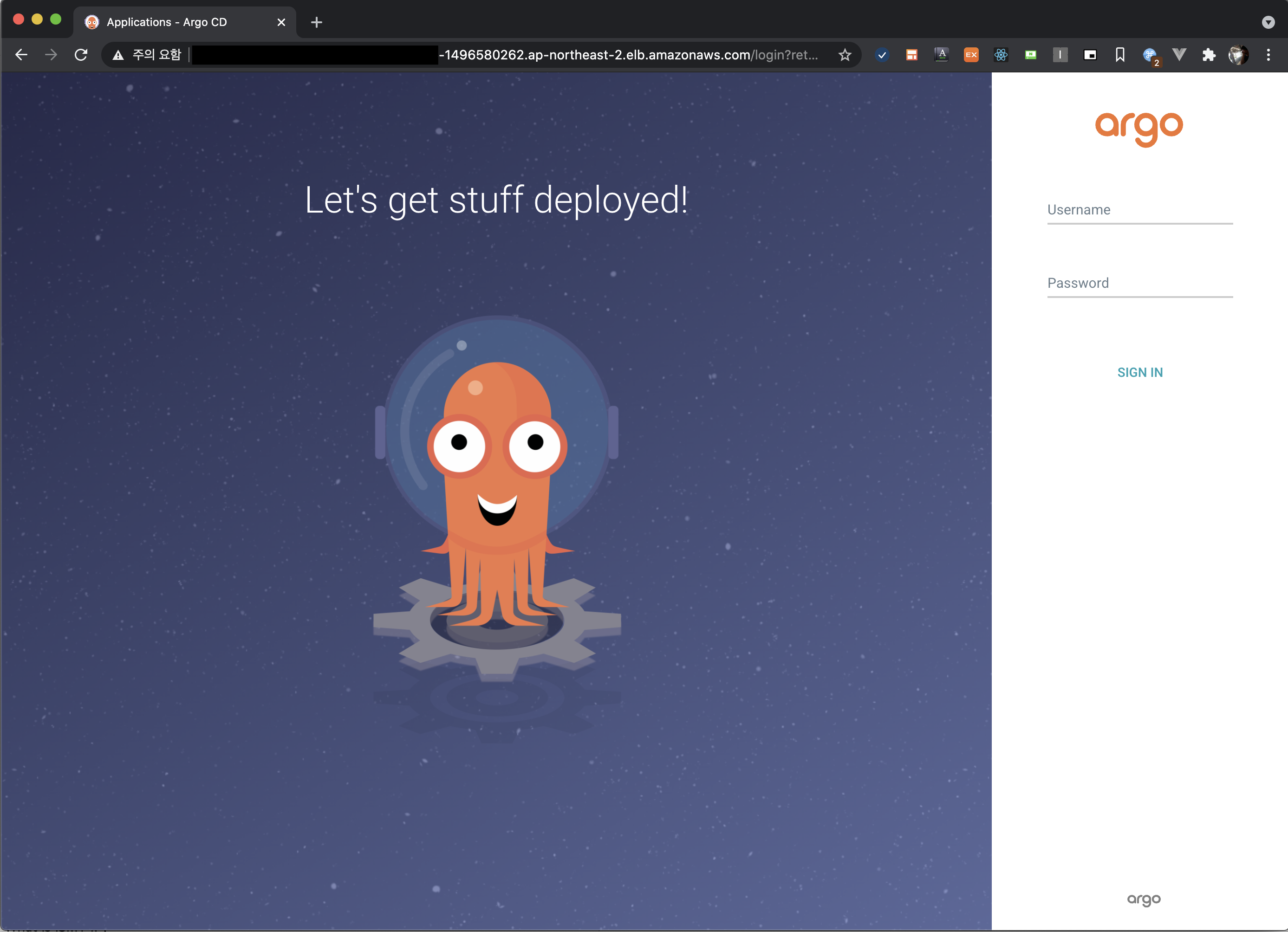 그리고 1단계에서 설치한 `argocd cli` 를 사용해 로그인한다. `$ARGOCD_SERVER` 차리에는 위에서 세팅한 LoadBalance의 Domain Name을 입력한다.